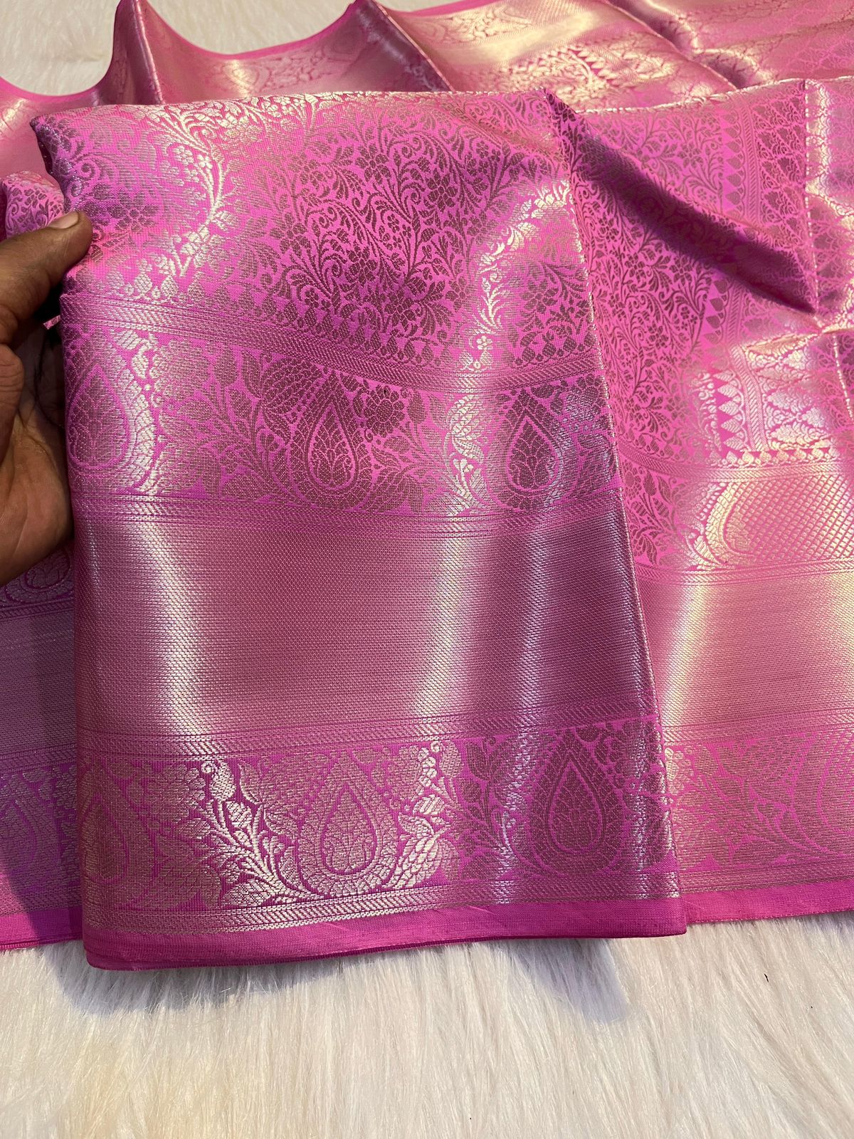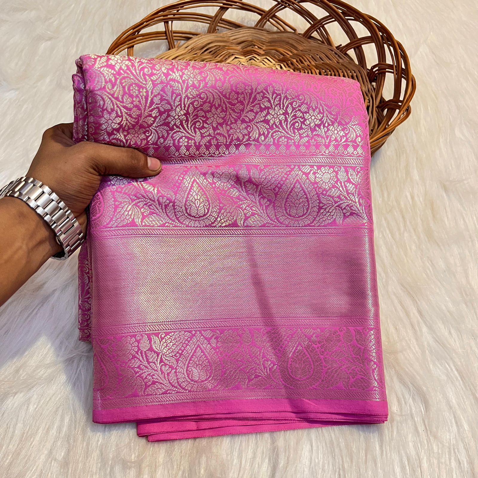 The joy in my heart doubles when I wear this pink silk saree. The silver lace designs add charm to the fabric and make me feel like a princess. When this traditional beauty is combined with a modern touch. my confidence increases even more.